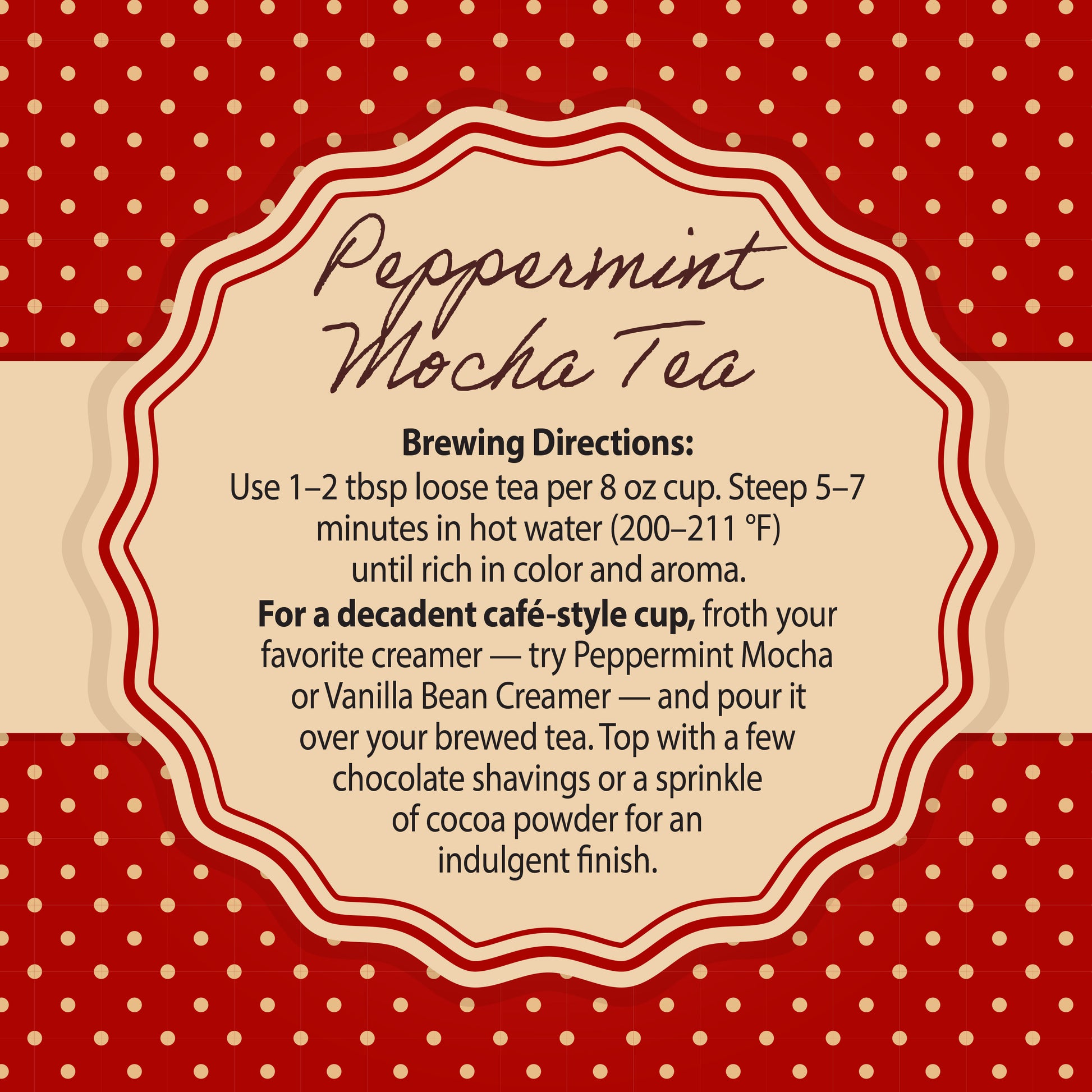 A cozy winter tea with cooling peppermint, soft mocha tones, and hints of chocolate comfort.